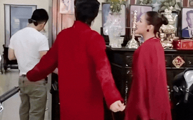 Trong clip lan truyền, Gil Lê mặc áo dài đỏ họa tiết, phối cùng quần tối màu và boots cao cổ. Xoài Non cũng chọn trang phục màu sắc đồng điệu. Cả hai đứng cạnh nhau trước bàn thờ, chắp tay thành kính. Sau đó, cả hai ngồi sát bên, trò chuyện tự nhiên trong không gian gia đình.