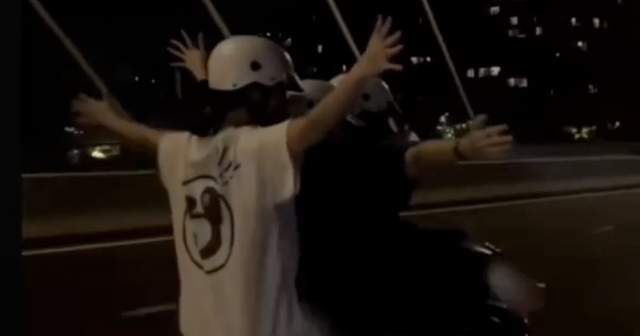 Chiều 4-1, mạng xã hội xôn xao clip 3 người chạy xe máy hiệu SH buông tay trên cầu Ba Son, TPHCM.