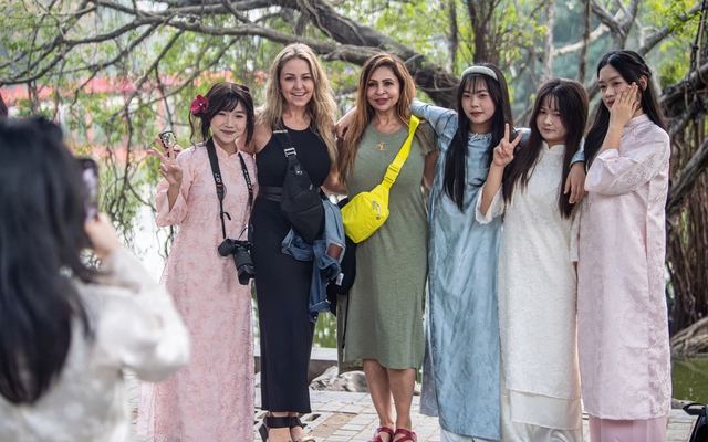 Dọc theo bờ hồ, hàng trăm người trong trang phục áo dài tập trung chụp ảnh. Kiểu dáng và màu sắc trang phục rất đa dạng, từ áo dài truyền thống đến áo dài cách tân.