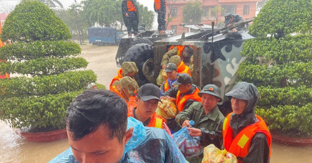 Ngày 21/11, LLVT Quân khu 5 sử dụng xe thiết giáp vận chuyển thực phẩm cứu trợ khẩn cấp cho bà con vùng lũ tỉnh Đắk Lắk (Ảnh: VGP).