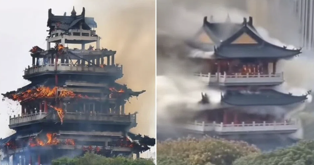 Đoạn clip lan truyền trên mạng xã hội ghi lại cảnh ngọn lửa bùng phát tại Văn Xương Các cao 3 tầng cho thấy một phần mái của tòa tháp sụp xuống trong khi khói đen cuồn cuộn bốc lên trời.