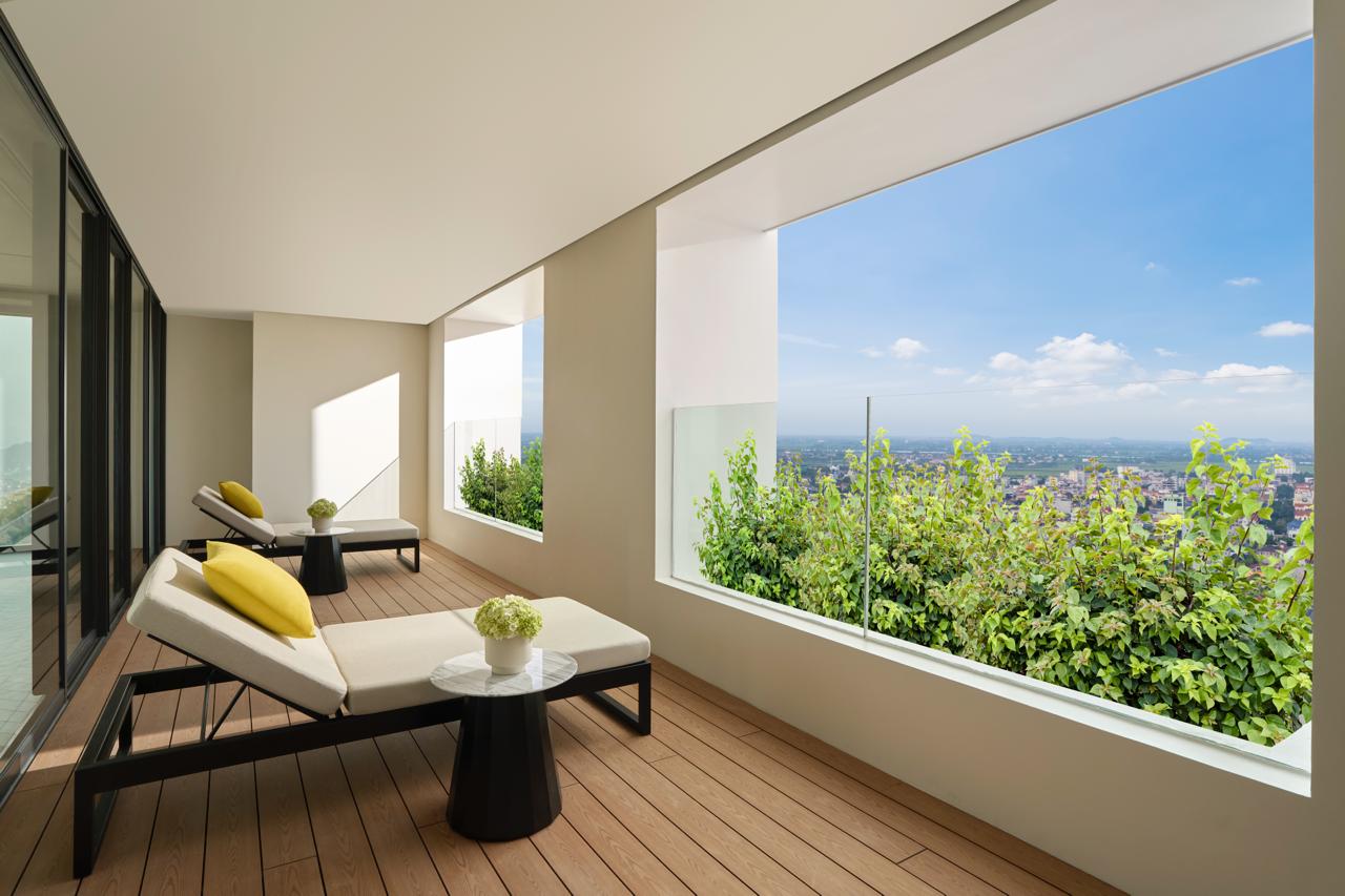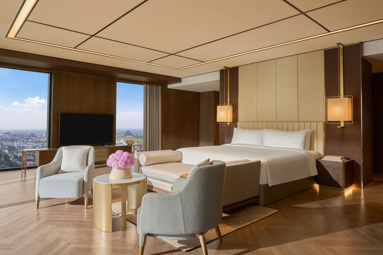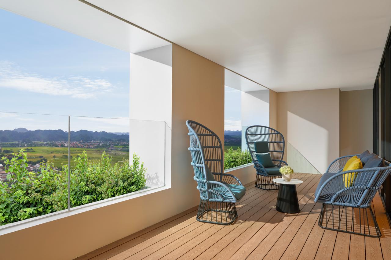 Sự xuất hiện của dự án lưu trú này ngay lập tức gây sốt trong giới xê dịch. Khách sạn tọa lạc ở vị trí kim cương, chỉ cách khu danh thắng Tràng An và Tam Cốc vỏn vẹn 15 phút di chuyển. Điểm nhấn khiến dân tình choáng ngợp nhất chính là toàn bộ 283 phòng nghỉ và suite tại đây đều sở hữu ban công riêng. Từ không gian mở này, du khách có thể phóng tầm mắt chiêm ngưỡng khung cảnh ngoạn mục của vùng đất được ví như "Vịnh Hạ Long trên cạn" với những dãy núi đá vôi hùng vĩ vươn mình giữa cánh đồng lúa bát ngát.
