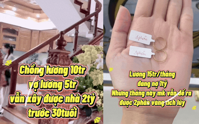 Người vợ chia sẻ: "Chồng lương 10 triệu, vợ lương 5 triệu vẫn xây được nhà 2 tỷ ở quê. Đất thì bố mẹ cho nên không mất tiền mua. Ngôi nhà này là sau 7-8 năm tích lũy vàng, đến lúc cần thì bán đi, được một khoản kha khá để xây nhà. Vợ chồng mình vay thêm 1 tỷ, gồm vay người thân 500 triệu và vay ngân hàng 500 triệu".