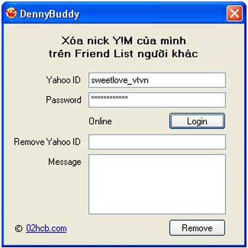 Tại trang web này, bạn tìm đến mục "Your Yahoo ID...". Bạn chỉ việc nhập nick của mình và nick của người bạn vào hai mục Your Yahoo ID và Other Person's ID để thực hiện công việc của mình. Ở mục Message, bạn có thể gửi thông điệp gì tuỳ ý. Sau đó bấm "Click to Remove" để hoàn tất.