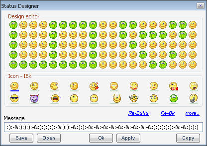- Status Designer: Cho phép bạn tự tay thiết kế các status “không đụng hàng”. Mặc định, khung Design editor sẽ hiển thị danh sách biểu tượng mặt cười quen thuộc, nhiệm vụ của bạn là chọn các biểu tượng khác ở trường Icon-Ibk. Sau đó, nhấn chọn các biểu tượng trong khung Design editor để thay thế và sắp xếp các biểu tượng này thành chữ cái hay đối tượng độc đáo nào đó tùy sở thích. Để thiết kế lại từ đầu bạn nhấn Re-Build, nhấn nút liên kết more để duyệt các biểu tượng mặc cười khác. Nội dung status thiết kế sẽ được thể hiện trong khung Message, khi đã ứng ý với “sản phẩm” của mình bạn nhấn Save để lưu status thành file văn bản (.txt) dùng cho những lần sau. Nếu muốn dùng ngay status cho nick đang mở bạn nhấn OK hay Apply.