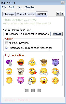 Có hai tùy chọn chính: Multiple Instance – hỗ trợ chat nhiều nick, và Automatically Run Yahoo! Messenger – tự động khởi chạy Yahoo! Messenger cùng Windows. Một chức năng cũng khá độc đáo nữa là thay đổi ảnh động đăng nhập vào Yahoo! Messenger, bạn chọn một trong các mẫu Audibles được cung cấp sẵn tại trường Login Animation, sử dụng hai nút Go Back và Next Flash File để di chuyển đến các mẫu khác. Nếu muốn dùng một file flash bất kỳ, bạn nhấn nút Browse để chọn.
