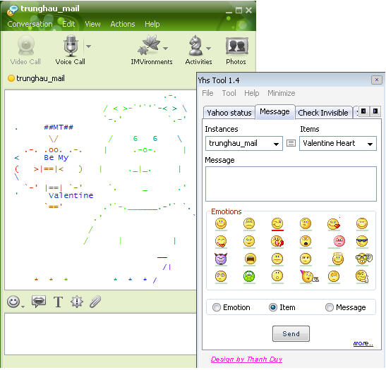 Trước tiên, bạn nhấn F5 để refresh, cập nhật lại các tính năng trên giao diện. Xong, bạn nhấn chuột vào hộp Instances chọn một trong các nick đang chat với bạn. Nếu muốn gửi các đối tượng độc đáo, bạn chỉ việc nhấn chọn các đối tượng trong hộp Items. Nếu chỉ gửi tin nhắn dạng văn bản bình thường, bạn gõ nội dung vào khung Message. Còn muốn gửi biểu tượng vui, bạn nhấn chọn biểu tượng trong khung Emotion, nhấn nút liên kết more ở góc dưới bên phải giao diện để xem và chọn các biểu tượng ẩn khác. Tùy theo, lựa chọn gửi ở trên, mà bước cuối cùng bạn chọn Emotion, Item hay Message. Sau cùng, nhấn Send để gửi tin nhắn đến bạn chat.