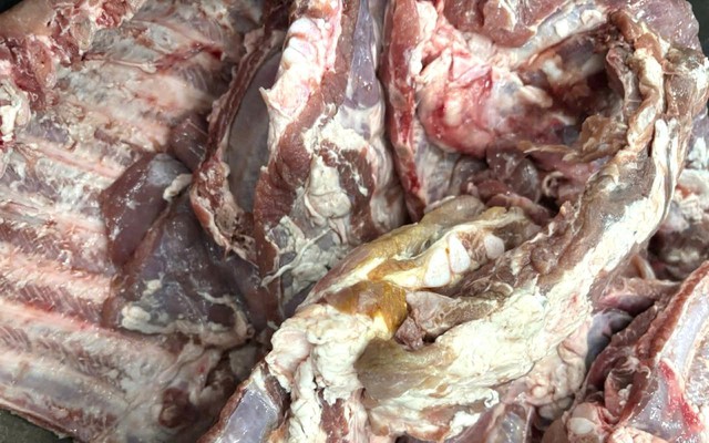 Trong quá trình kiểm tra, đoàn đã phát hiện 90 kg thịt sườn heo đông lạnh, trong đó một số phần thịt đã chuyển sang màu vàng, xanh.