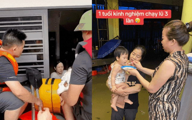 "Mới 1 tuổi mà kinh nghiệm chạy lũ 3 lần, 1 lần chạy lụt đòi ra, lần 2 là tuần đầu, lần 3 là hôm nay. Và bây giờ, 1 tuổi phải ăn bánh chưng cầm hơi do ông nuôi tiếp tế, không khóc nổi luôn đấy" - người mẹ chia sẻ.