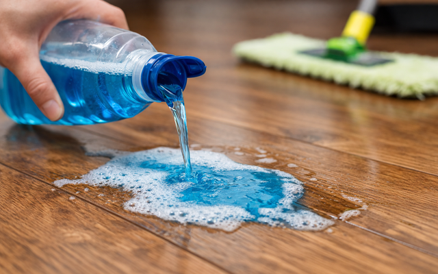 Nhiều loại nước lau sàn có chất tẩy mạnh. Khi bị đổ trực tiếp, nồng độ cao làm mờ lớp phủ, khiến gỗ dễ phồng khi gặp hơi nước hoặc đổi mùa.
