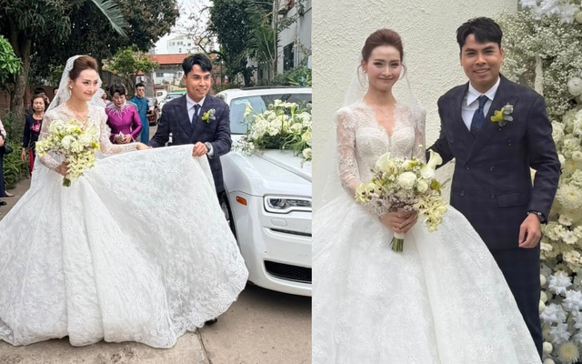 Tiền vệ Đức Huy đi siêu xe Rolls-Royce rước MC Huyền Trang Mù Tạt về dinh, visual cô dâu sáng bừng ngày cưới