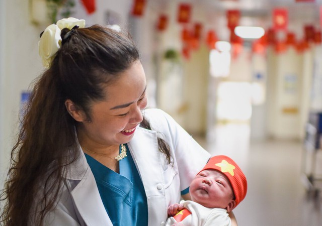 Bác sĩ Vũ Ngân Hà bên những thiên thần nhỏ sinh tại khoa Sản thường, Bệnh viện Phụ Sản Trung ương. (Ảnh: Bống Vũ)