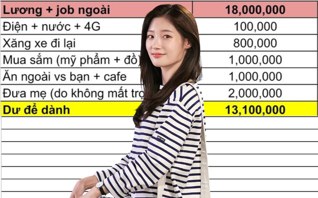 Tận dụng lợi thế không phải thuê nhà, và được gia đình hỗ trợ nhưng cũng không thể phủ nhận nỗ lực tiết kiệm của cô gái này. Dù mới ra trường đi làm chưa lâu, cô đã để dành được 1 cây vàng và 70 triệu tiền mặt. Hàng tháng chi tiêu chỉ 5 triệu quay đầu, với mức thu nhập 18 triệu, cô tiết kiệm được 13,1 triệu/tháng.
