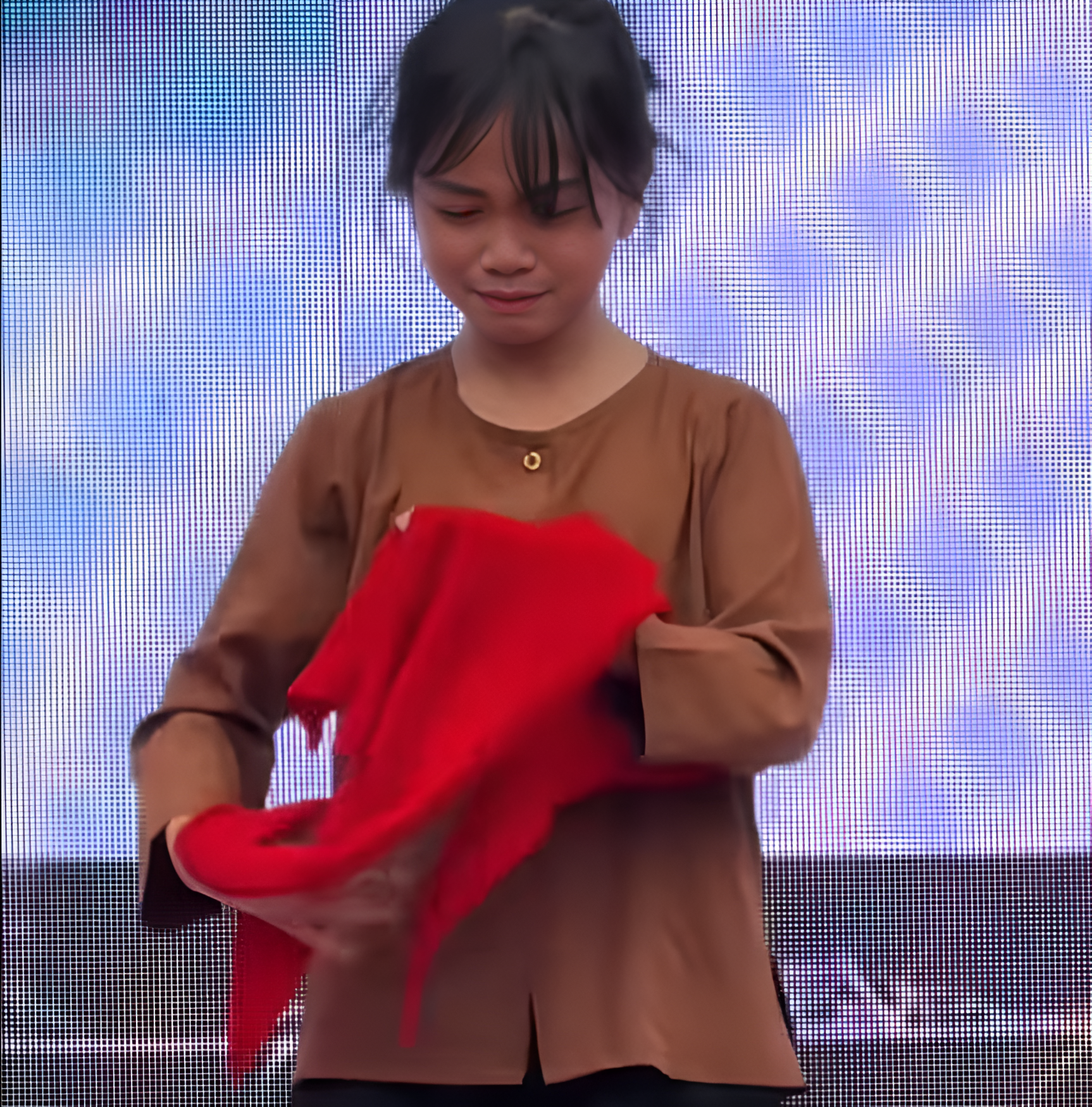 Điểm nhấn đặc biệt của tiết mục nằm phân cảnh em cầm trên tay kỷ vật có in hình lá cờ đỏ sao vàng, biểu tượng cho người con đã hy sinh. Ánh mắt rưng rưng, đôi tay run nhẹ, gương mặt như kìm nén cảm xúc… tất cả được thể hiện một cách tự nhiên đến mức khiến nhiều người xem phải bất ngờ.