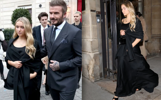 Xuất hiện tại show Haute Couture Xuân Hè 2026 ở Paris, Harper đi ngay phía sau mẹ - nhà thiết kế Victoria Beckham. Cô bé xinh đẹp và khí chất trong chiếc váy đen dài chấm gót, kết hợp giày peep-toe và khăn choàng ton-sur-ton. Mái tóc vàng uốn sóng nhẹ, Harper giữ ánh mắt nhìn xuống, lặng lẽ bước cạnh cha mình là Sir David Beckham. Cả gia đình bước bên nhau tạo nên khung hình vừa sang trọng vừa trầm lắng.