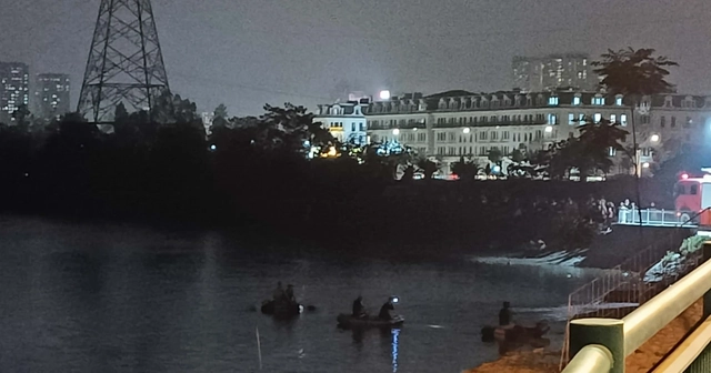 Lực lượng cứu hộ huy động 3 thuyền nhỏ tìm kiếm trên mặt nước. Nhiều người dân có mặt xung quanh khu vực hồ điều hòa theo dõi sự việc.