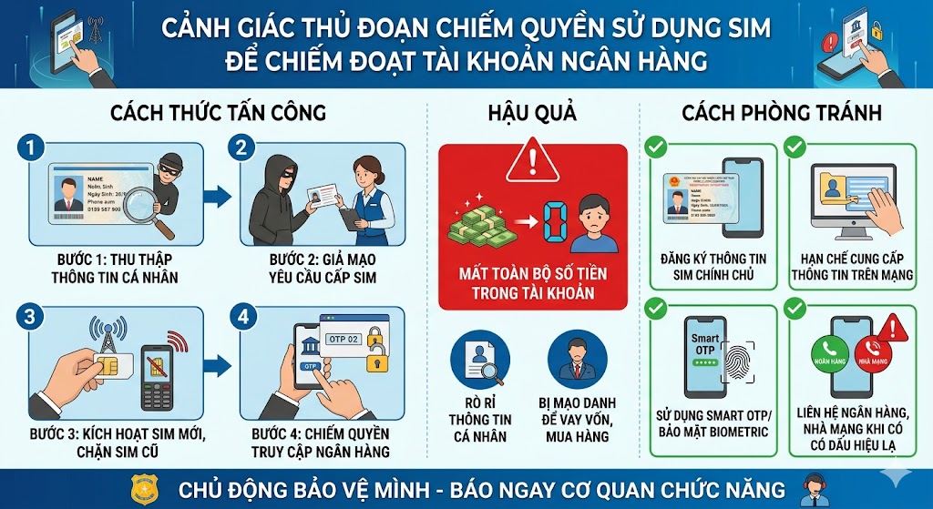 Tuy nhiên, đi cùng sự thuận tiện đó là nguy cơ gia tăng các loại tội phạm công nghệ cao. Một trong những thủ đoạn đáng lo ngại hiện nay là chiếm quyền sử dụng SIM điện thoại (SIM Swap) nhằm xâm nhập tài khoản ngân hàng và chiếm đoạt tài sản.