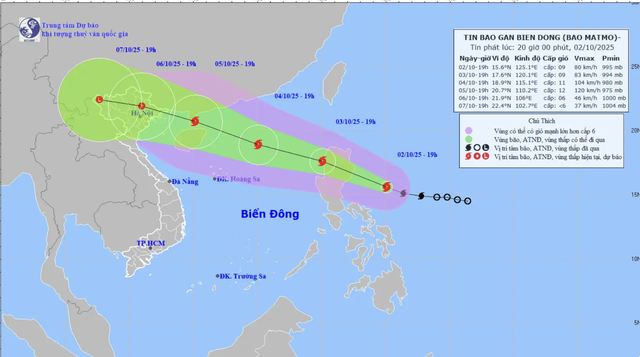 Theo thông tin từ Trung tâm Dự báo khí tượng thủy văn quốc gia, hồi 19 giờ ngày 2/10, vị trí tâm bão Matmo ở vào khoảng 15,6 độ Vĩ Bắc; 125,1 độ Kinh Đông, trên vùng biển phía Đông Philippines. Sức gió mạnh nhất vùng gần tâm bão mạnh cấp 8-9 (62-88km/giờ), giật cấp 11. Di chuyển theo hướng Tây Tây Bắc, tốc độ khoảng 25km/h.