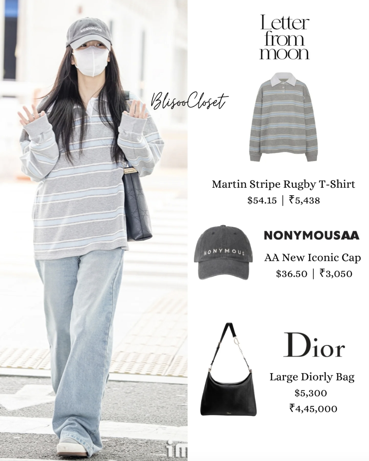 Dù biết trước sẽ có hàng loạt ống kính săn đón cho lần xuất hiện đặc biệt, nhưng cách Jisoo lựa chọn hình ảnh cho mình lại cực kỳ đơn giản và mộc mạc. Không phải full look Dior sang chảnh hay sự thanh lịch phóng khoáng của Tommy Hilfiger, Jisoo diện một chiếc áo rugby shirt oversized đến từ thương hiệu nội địa Hàn Quốc Letter From Moon, kết hợp cùng quần jeans ống đứng, sneakers và một chiếc mũ lưỡi trai tối màu. Điểm nhấn hàng hiệu duy nhất chính là chiếc Diorly Bag - một mẫu túi mới của Dior vừa lên kệ. Tổng thể trang phục tạo nên một bản phối hết sức đời thường, giống hệt những hình ảnh mà người hâm mộ vẫn luôn bắt gặp trong các Daily Vlog của thành viên BLACKPINK.