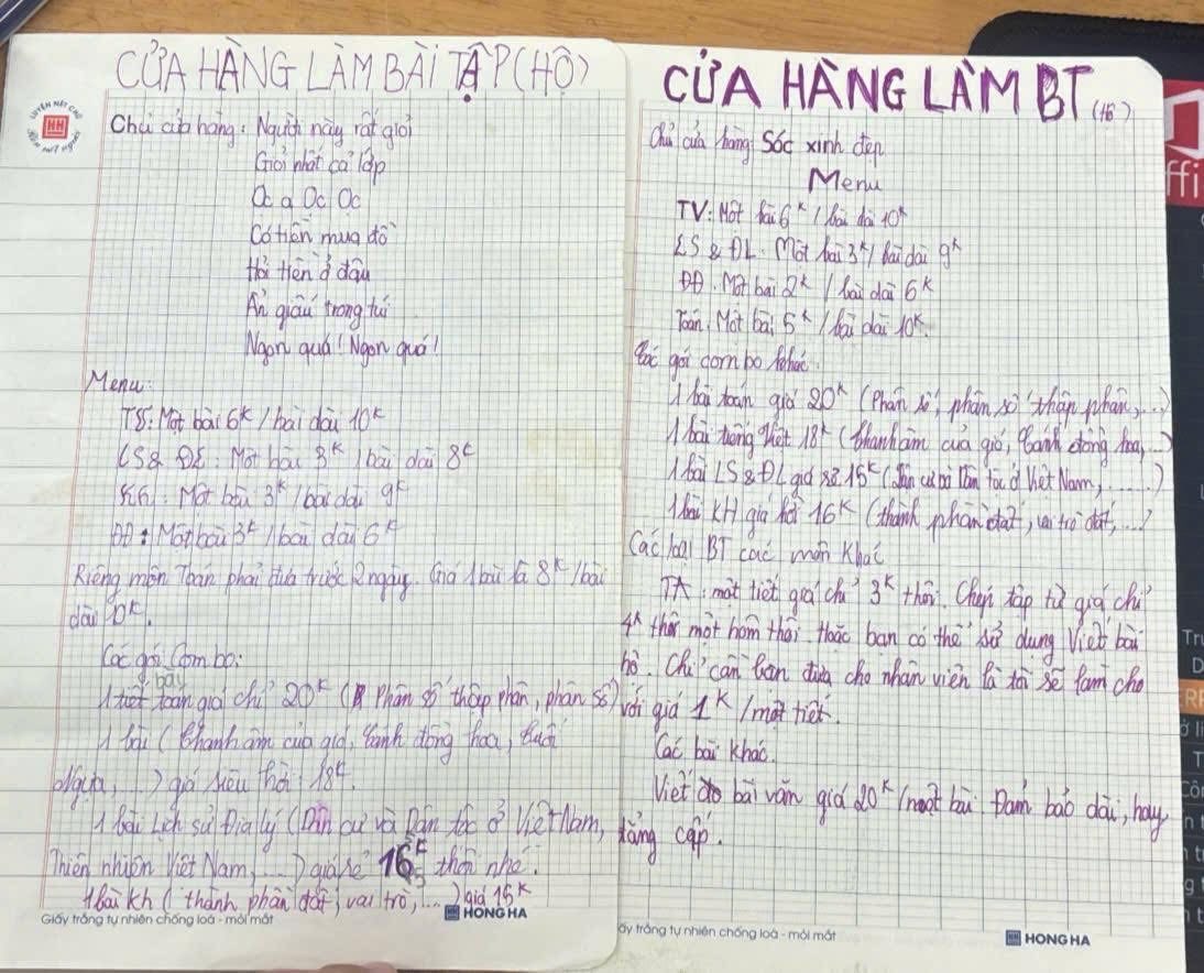 Nhìn vào bảng giá, người ta không khỏi bật cười trước sự chuyên nghiệp của bé: Tiếng Việt bài ngắn 6k, bài dài 10k; Lịch sử và Địa lý chỉ từ 3k-8k; đặc biệt bài văn "đảm bảo dài, hay, đẳng cấp" có giá 20k. Để tăng độ uy tín, chủ tiệm còn tự giới thiệu mình là "người giỏi nhất lớp". Tuy nhiên, đằng sau những con số ngây ngô ấy là một cuộc tranh luận nảy lửa giữa hai luồng quan điểm trái chiều.