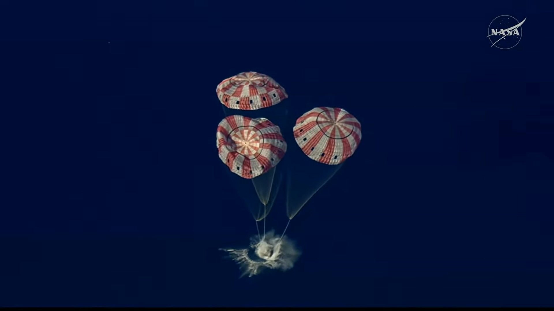 Dưới sự nâng đỡ của 3 chiếc dù chính, vận tốc của Orion được kéo giảm từ 500 km/h xuống chỉ còn khoảng 25 km/h khi chạm mặt nước. Hệ thống túi khí trên đỉnh tàu ngay lập tức được thổi phồng để đảm bảo khoang tàu luôn ở trạng thái thẳng đứng trên sóng biển Thái Bình Dương.