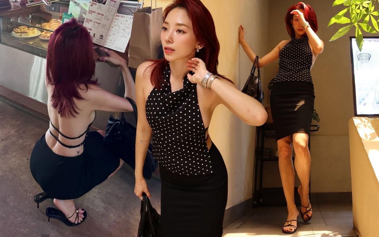 Họa tiết chấm bi hot hit mùa hè nhanh chóng được Tóc Tiên thêm vào tủ đồ. Cô chọn diện chiếc áo yếm chấm bi, khéo khoe lưng trần gợi cảm, kết hợp cùng chân váy lửng tạo nên diện mạo vừa thoải mái năng động, vừa giữ được nét điệu đà, sang trọng đầy cuốn hút.
