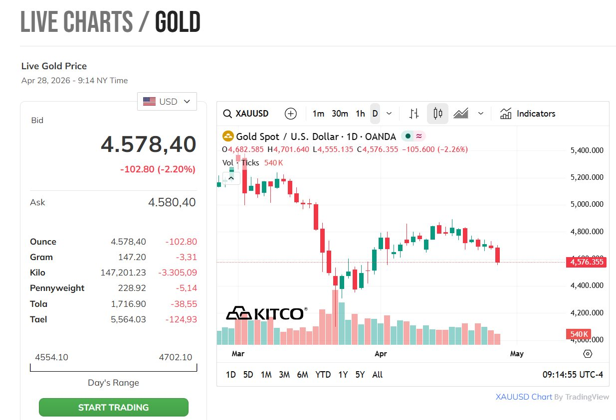 Trên thị trường quốc tế, giá vàng giao ngay ghi nhận tối ngày 28/4 giảm hơn 2% xuống còn 4.585 USD/ounce. Trước đó, giá vàng đã giảm gần 0,6% trong phiên hôm qua (27/4) và giảm 2,5% trong tuần trước.