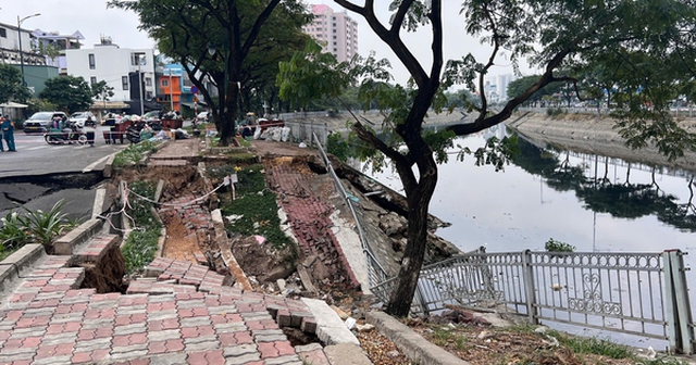 Tại hiện trường, đoạn sạt lở ăn sâu vào mặt đường, dài gần 50m, tạo thành hố sâu. Nhiều mảng nhựa đường, vỉa hè bị đứt gãy.
