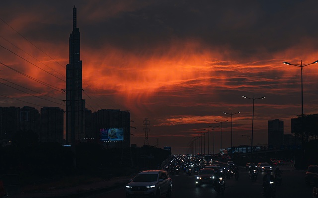 Trên các cây cầu và trục đường lớn, dòng xe ken dày trong ánh đèn pha hòa cùng nền trời rực lửa, tạo nên những khuôn hình đậm chất điện ảnh. Mặt trời đỏ au lơ lửng phía chân trời, mây tầng cuộn vệt dài như dải lụa, phản chiếu sắc màu xuống mặt đường và các tòa nhà cao tầng.