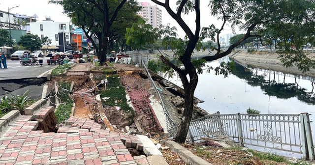 Lún sụp bờ kè kênh Tàu Hủ, đường Ba Đình đứt gãy (ẢNH: ĐÔNG HOA).