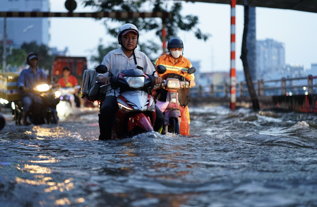 Theo ghi nhận của PV, khoảng 17h chiều ngày 9/10, tuyến đường Trần Xuân Soạn (phường Tân Hưng, TP.HCM) bất ngờ chìm trong nước do triều cường. Nước dâng nhanh khiến giao thông qua khu vực gặp nhiều khó khăn, hàng loạt xe máy bị tắt máy, người dân phải dắt bộ, ngập đến tận nửa bánh xe, nhiều phụ huynh đưa đón con cũng thấy lo ngại.