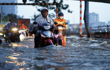Đường phố TP.HCM hóa sông, người dân vật vã di chuyển trong dòng nước đục.