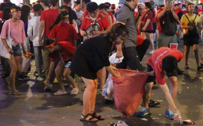 Đêm nay, hàng nghìn người đổ về phố đi bộ Nguyễn Huệ để cổ vũ cho đội tuyển Việt Nam trong trận chung kết AFF Cup. Tuy nhiên khi kết thúc trận đấu, dòng người ùa ra đường "đi bão" để lại lượng rác thải lớn khiến nhiều bạn trẻ cùng lực lượng công nhân vệ sinh môi trường dù làm việc liên tục cũng không dọn kịp.