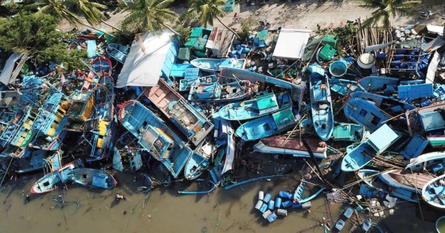 Hàng trăm tàu của người dân thôn Vũng Chào, phường Sông Cầu, tỉnh Đắk Lắk, bị hư hỏng nặng. Ảnh: CAO NGUYÊN