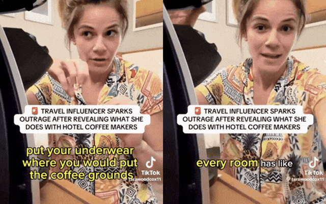 Cụ thể, một đoạn video lan truyền chóng mặt trên mạng xã hội đã ghi lại cảnh nữ TikToker thản nhiên thực hiện một "mẹo du lịch" khiến người xem phải rùng mình. Thay vì sử dụng dịch vụ giặt là hoặc mang đủ đồ dùng, cô gái này đã chọn cách cho thẳng đồ lót của mình vào ngăn chứa nước của máy pha cà phê trong phòng khách sạn rồi nhấn nút đun sôi để  khử trùng. Hành động này được cô quảng bá như một cách tiết kiệm thời gian và công sức khi đi du lịch dài ngày.