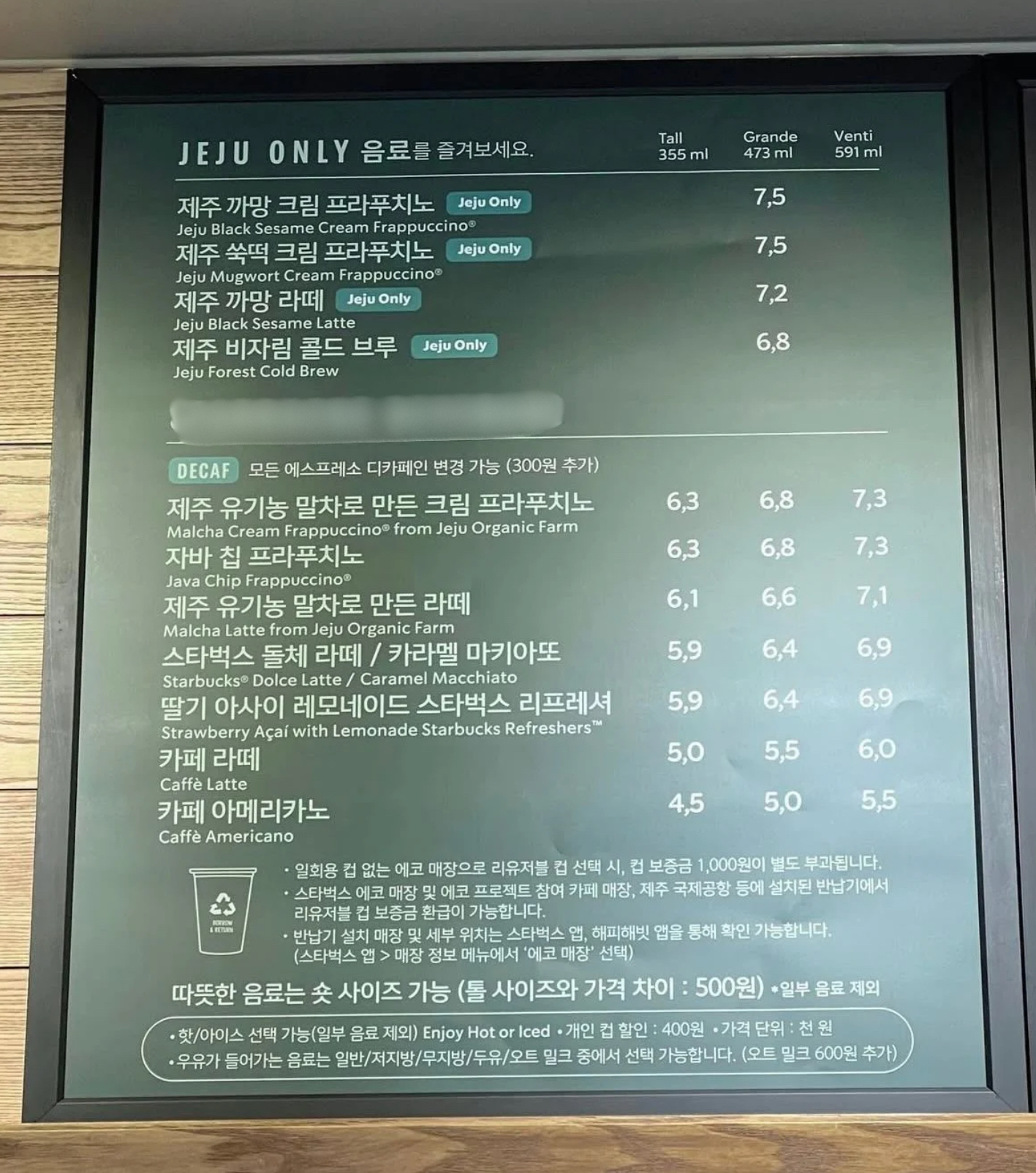 Menu của hãng cà phê S tại Việt Nam