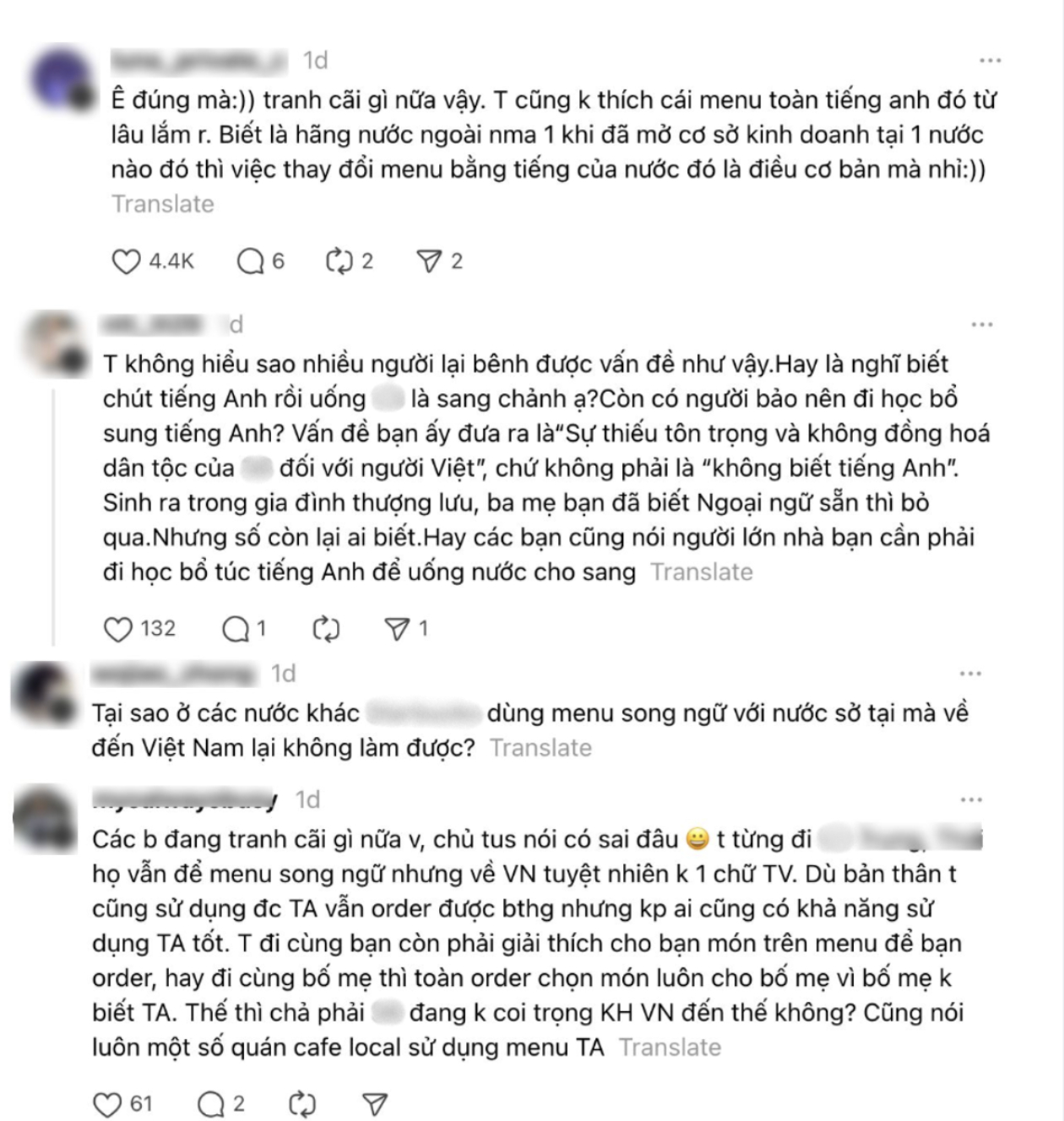 Một cuộc tranh luận đang thu hút sự chú ý lớn trên mạng xã hội những ngày gần đây xoay quanh việc một chuỗi cà phê nhượng quyền quốc tế hoạt động tại Việt Nam sử dụng thực đơn chủ yếu bằng tiếng Anh. Theo phản ánh từ nhiều bài đăng phần tiếng Việt trên bảng gọi món xuất hiện khá hạn chế hoặc không đi kèm giải thích rõ ràng về các đơn vị đo lường đặc thù.