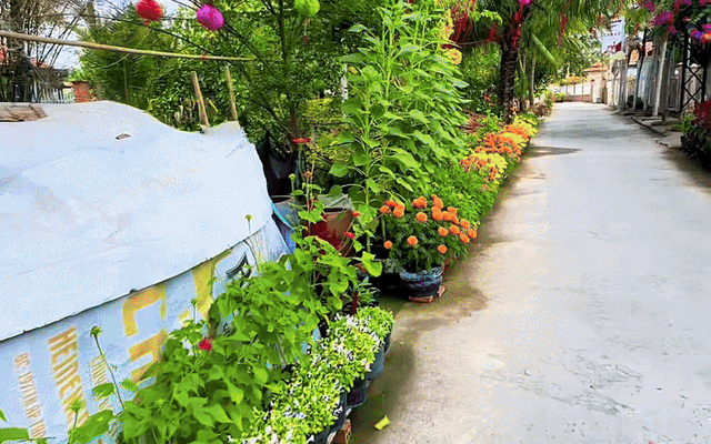 Không nhất thiết phải ra chợ hoa, người miền Tây tự trồng hẳn hoa cho nhà mình. Hoa trải dài khắp cổng nhà, dọc lối đi về như con đường mùa xuân sặc sỡ. Chẳng cần những loại hoa sang trọng, đắt đỏ, họ ưu tiên những loại hoa dễ trồng, từng chậu đặt sát nhau. Hoa nở càng nhiều càng thích, tha hồ để "ganh đua" với xóm làng.