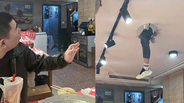 Ngày 22/3, đoạn video chia sẻ từ người đàn ông họ Triệu nhanh chóng lan truyền trên mạng xã hội, ghi lại khoảnh khắc thực khách dùng bữa thì trần nhà hàng bất ngờ vỡ toác, lộ ra một chân người thò xuống.