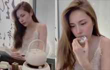 Thuý Ngân dùng tay ôm mặt, cười gượng sau cái "tát yêu" của Trường Giang