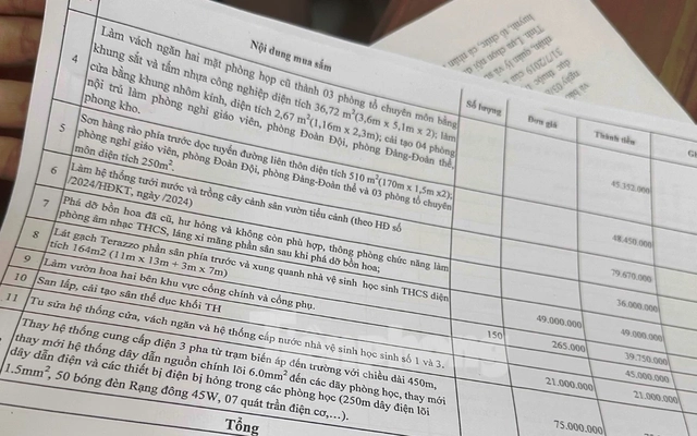 Ngoài ra, trường còn liệt kê chi tiết nhiều hạng mục khác như: Làm hệ thống tưới nước, trồng cây cảnh (hơn 79 triệu đồng); phá dỡ bồn hoa cũ, hư hỏng, không còn phù hợp (36 triệu đồng); làm vườn hoa hai bên cổng chính và phụ (hơn 39 triệu đồng); san lấp, cải tạo sân thể dục khối tiểu học (45 triệu đồng)…