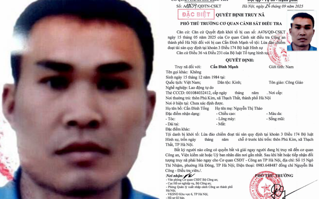 Căn cứ vào tài liệu điều tra, ngày 15/5/2025, Cơ quan CSĐT Công an Thành phố đã ra quyết định khởi tố bị can đối với Cấn Đình Mạnh về tội lừa đảo chiếm đoạt tài sản. Tuy nhiên đối tượng đã bỏ trốn khỏi nơi cư trú. Ngày 26/9/2025, CSĐT Công an Thành phố đã ra quyết định truy nã bị can đối với Cấn Đình Mạnh.