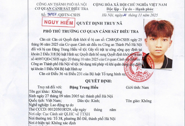 Ngày 21/11, Cơ quan CSĐT Công an TP. Hà Nội đã ra quyết định truy nã Đặng Trung Hiếu (SN: 2005; thường trú tại: phường Bồ Đề, TP. Hà Nội) về tội Gây rối trật tự công cộng và sử dụng trái phép vũ khí quân dụng.
