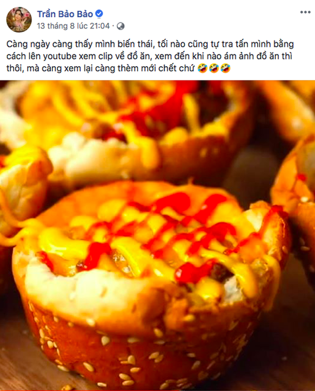 Vừa xong bữa tối, mới 9h mà BB Trần đã phải lên Facebook cảm thán với mọi người rồi: “Càng ngày càng thấy mình biến thái, tối nào cũng tự tra tấn mình bằng cách lên Youtube xem clip về đồ ăn, xem đến khi nào ám ảnh đồ ăn thì thôi, mà càng xem lại càng thèm mới chết chứ”.