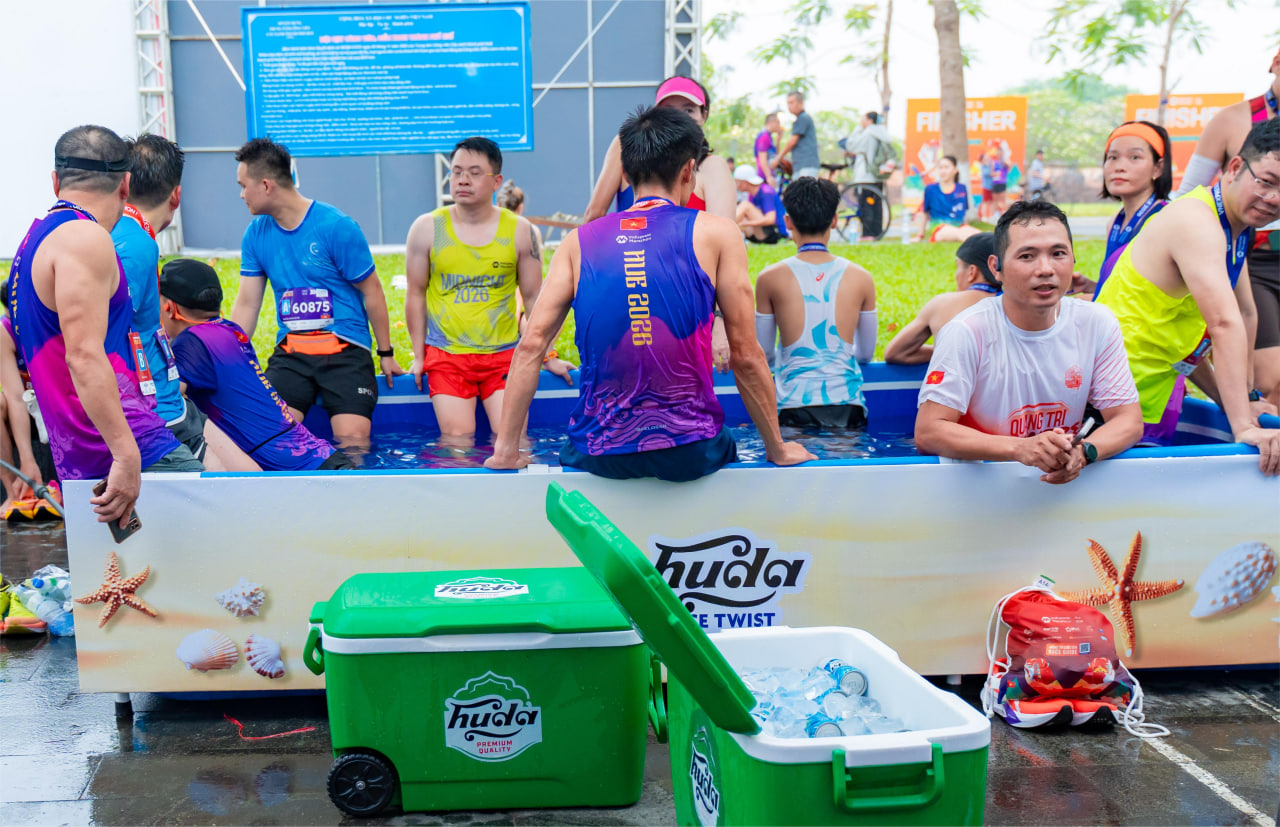 Ban đầu nhìn từ xa, nhiều người tưởng khu đích chỉ dựng vài phông bạt để check-in cho có không khí. Nhưng tới gần mới thấy không đơn giản: quạt mát chạy liên tục “giải nhiệt” cái nắng gắt, DJ mang đến âm nhạc sôi động và nổi bật nhất là hồ nước siêu to ngay trung tâm. Hàng ngàn runner rủ nhau xắn quần, ngâm chân tại booth Huda. Sau quãng đường dài, được thả lỏng cơ bắp trong làn nước mát lạnh – đúng là trải nghiệm sảng khoái khó có từ ngữ nào tả xiết.