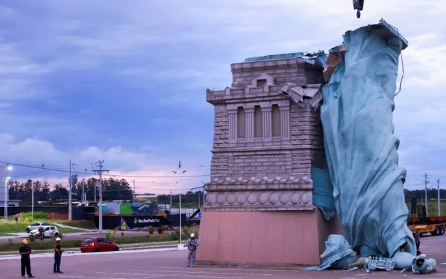 Một bức tượng “Nữ thần Tự do” bản sao, cao khoảng 24m, sụp đổ trong cơn bão dữ dội quét qua miền Nam Brazil.