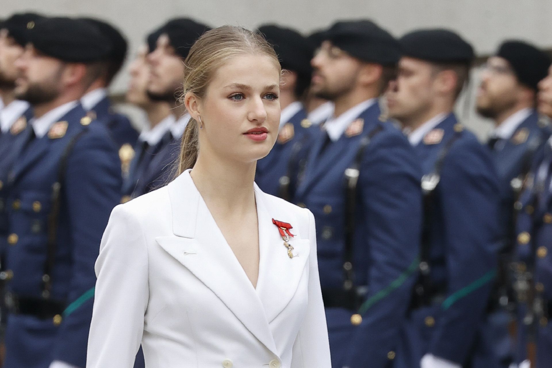 Thay vì chọn những bộ đầm dạ hội lộng lẫy, các nghệ nhân đã quyết định đóng băng khoảnh khắc mang tính biểu tượng nhất của Công chúa Leonor: Ngày cô tuyên thệ trung thành với Hiến pháp Tây Ban Nha. Bức tượng khoác lên mình bộ suit màu trắng thanh lịch, bao gồm áo blazer cài khuy chéo và quần âu ống ôm sát.