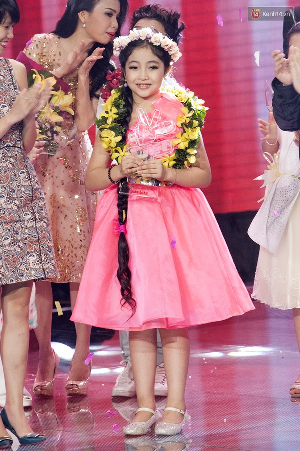 Nụ cười hạnh phúc của "công chúa tóc mây" Hồng Minh trong giây phút đăng quang. Cô bé chia sẻ rằng, mình cũng không biết lý do gì có thể vượt qua được các anh chị để chạm vào chiếc cúp chiến thắng. "Qua các vòng thi, em chỉ biết cố gắng hết mình trong các bài hát để mang đến cho khán giả sân khâu tốt nhất", em nói