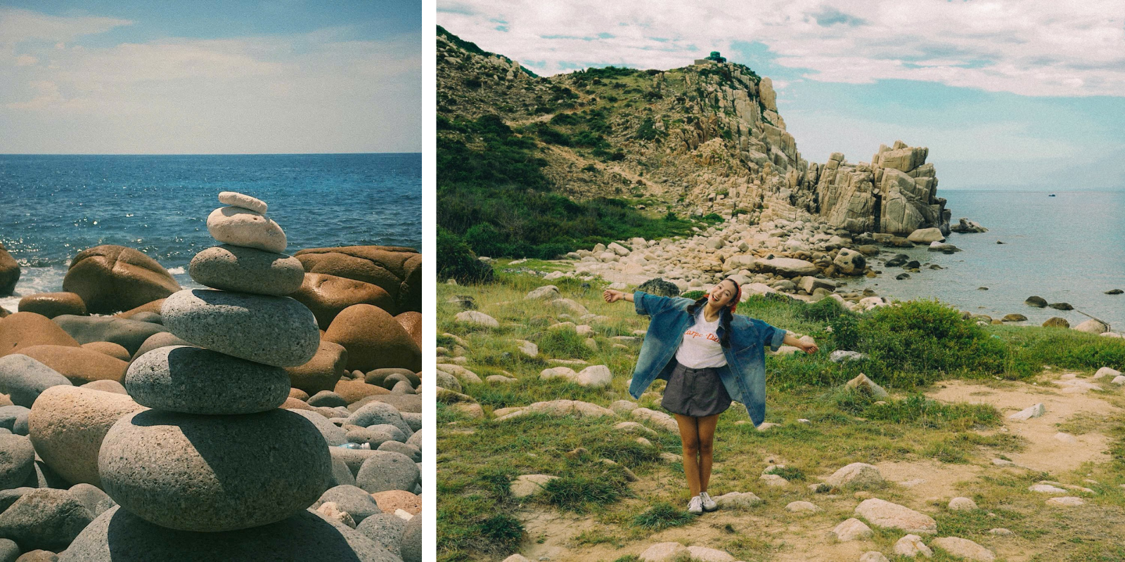 Nét hoang sơ đẹp như tranh vẽ của Bãi Đá Trứng với những khối đá bo tròn khổng lồ và Bãi Đế thơ mộng nơi thảm cỏ xanh ngát trải dài ra tận đại dương (@quoc.su và @Riri Phương Trinh)