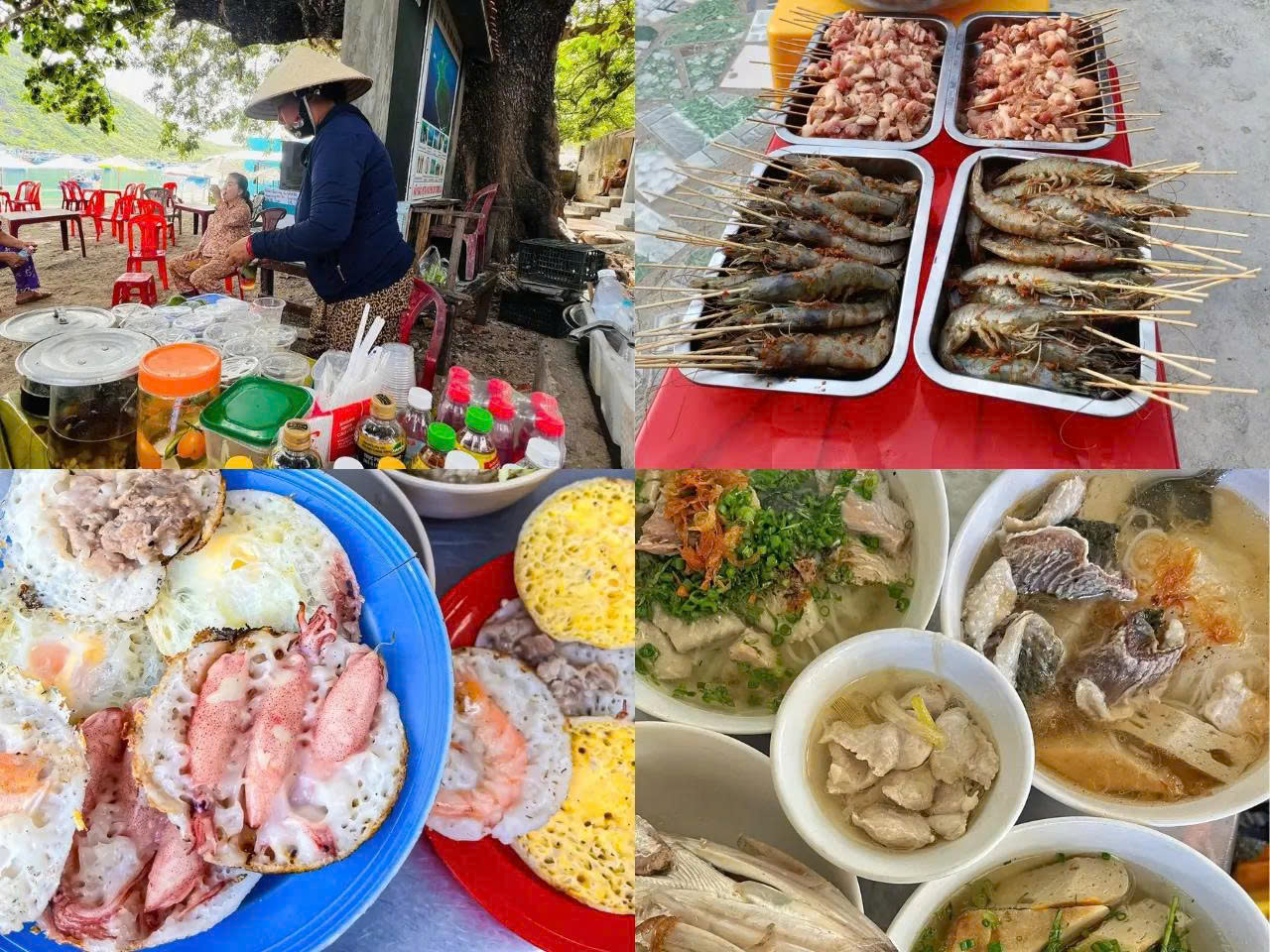 Để có một bát bún cá, bánh canh chả cá hay ổ bánh mì nướng thơm lừng thết đãi khách xa đến, người dân đã phải cất công nhập từng cọng bún, mớ rau từ đất liền mang qua mỗi ngày, rồi tự tay chế biến một cách chỉn chu nhất. Đánh chén xong bữa chính, nếu chiều chiều đi dạo ngắm biển mà thấy buồn miệng, bạn cứ tấp thẳng vào những gánh hàng nhỏ hay tiệm tạp hóa mộc mạc mang đậm nét hoài niệm ven đường. Ở đó bán đủ thứ món ăn vặt lai rai như nem cuốn, bánh tráng và cả mấy ly nước giải khát đủ màu sắc y như trước cổng trường ngày xưa.